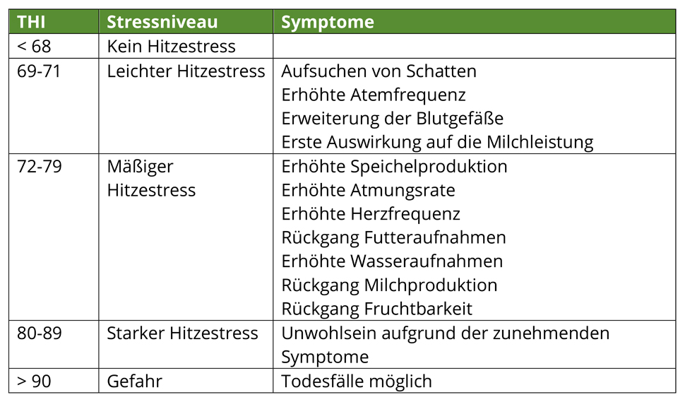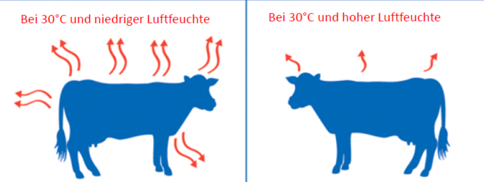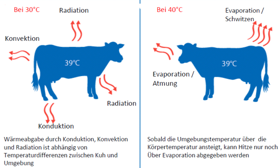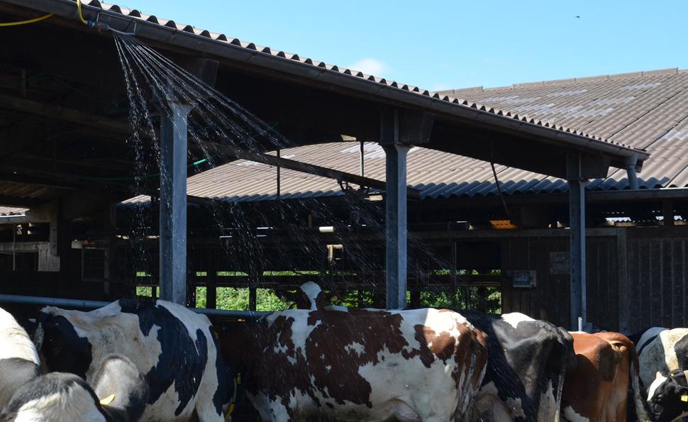 Eine weitere Möglichkeit die Tiere zu kühlen kann die Kondensation von Wasser sein. Dazu stehen zwei Möglichkeiten zur Verfügung, die grundsätzlich nach dem gleichen physikalischen Prinzip arbeiten. Bei der Hochdruckvernebelung wird Wasser feinst vernebelt in die Stallluft eingebracht. Dieses Wasser verdampft sofort und kühlt dadurch die Luft. Eine weitere Methode ist die Niederdruckversprühung. Hier wird das Wasser großtropfig auf die Kühe versprüht. Das Fell der Tiere wird nass. Mit Hilfe der aufgestauten Wärme aus dem Körper wird die Haut getrocknet und das Wasser verdunstet (Kuhduschen). Bei allen Varianten, die mit Wassereintrag arbeiten, ist zu beachten, dass dadurch die relative Luftfeuchtigkeit im Stall erhöht wird, was die Wirkungsbreite je nach Luftfeuchtigkeit einschränkt und sich unter Umständen negativ auf die Stallhygiene auswirkt. Solche Systeme können nur gut funktionieren, wenn die Feuchtigkeit auch wieder schnell aus dem Stall abgeführt werden kann. Die Verdunstungskühlung kann einen positiven Effekt auf den Hitzestress-Level haben, allerdings weist sie u.U. nur ein sehr enges Wirkungsfenster auf.