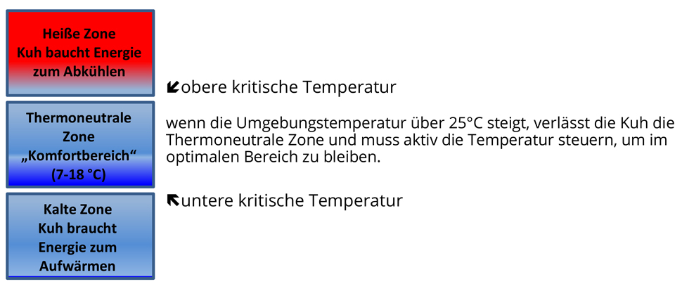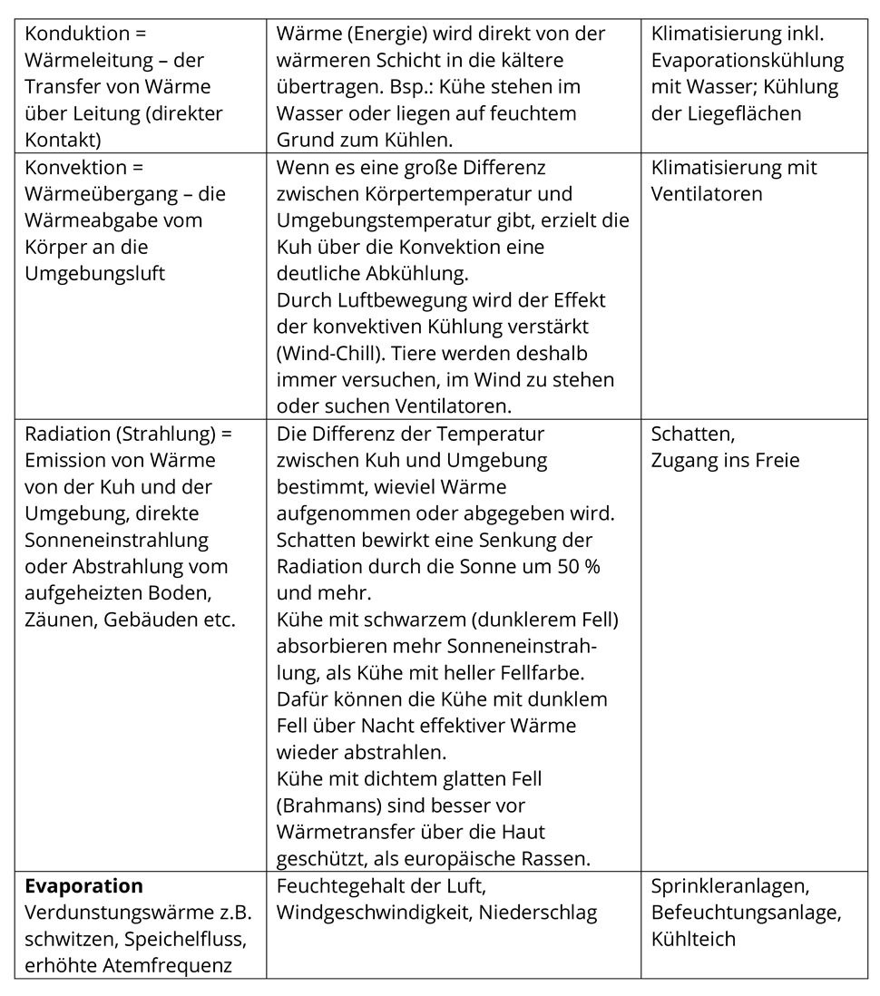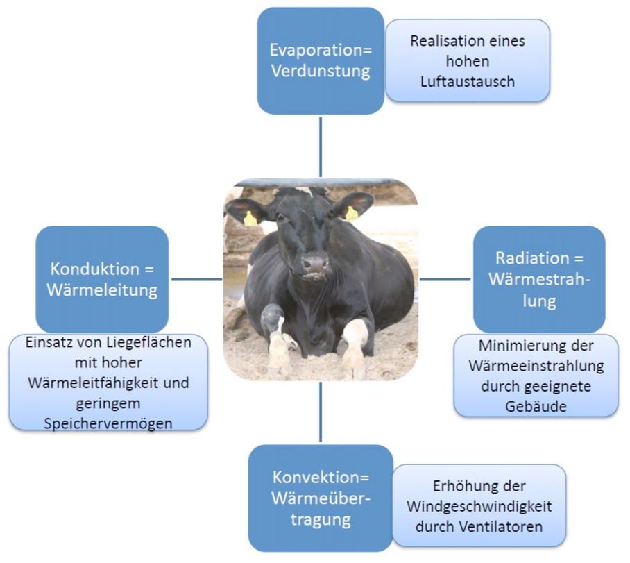 Ventilatoren können aber auch direkt zur Kühlung der Kühe durch den Wind-Chill-Effekt eingesetzt werden. Durch die Erhöhung der Luftgeschwindigkeit an den Tieren kann deren Wärmeabgabe erleichtert werden. Dazu sind Luftgeschwindigkeiten von mindestens 2 m/s auf dem Tier nötig, um einen Abkühlungseffekt zu erzielen. Luftgeschwindigkeiten bis 5 m/s haben für die Kühe dabei in der Regel keine negativen Konsequenzen.