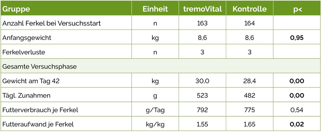 Positiv auf den Gewinn wirken sich die eingesparten Futtermengen durch eine bessere Futterverwertung und die höheren Verkaufsgewichte der Ferkel nach 42 Tagen aus. Je nach Futterkosten entstand so durch den Einsatz von tremoVital ein Kostenvorteil zwischen 0,7 und 1,16 € pro Ferkel im Durchschnitt aller Durchgänge. In den Durchgängen, die in den Kontrollgruppen Probleme andeuteten, waren es bis zu 2,5 Euro.