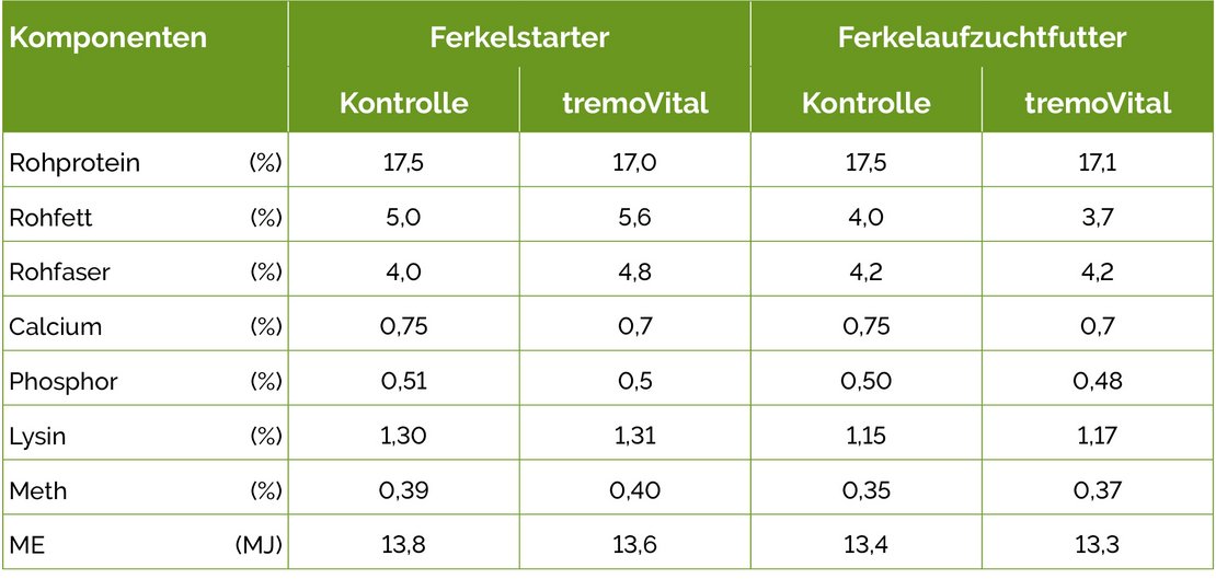 Eingesetzt wurden zwei, an die zwei Futterphasen angepasste, Fasermixe der Marke „tremoVital“ mit jeweils 5% der Mischung. Die in der ersten Fütterungsphase Rohfasergehalte von ca. 32% und in der zweiten Phase von ca. 17% aufwiesen. Weitere Inhaltsstoffe sind beim Verfasser erfragbar. Die Zusammensetzungen der Fasermixe sahen folgendermaßen aus: