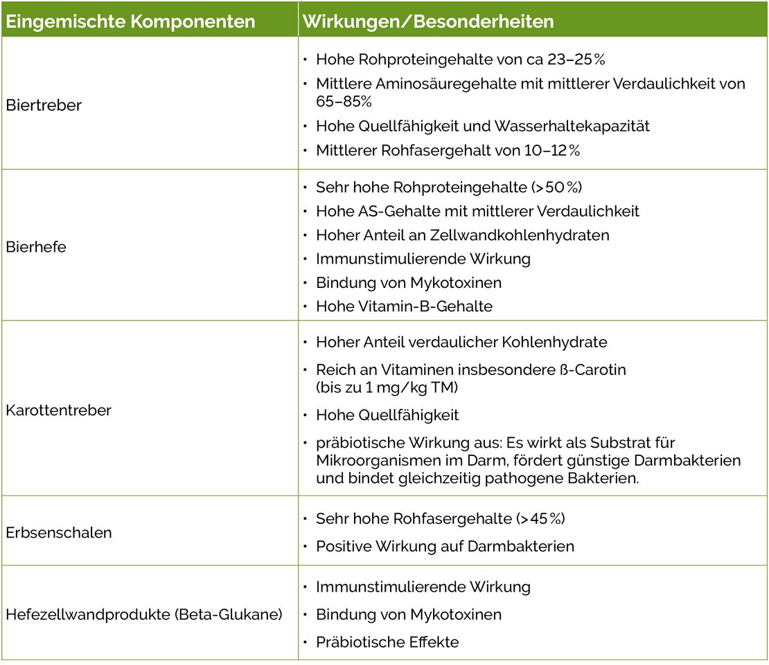 Biertreber, Apfeltrester, Erbsenschalen, Karottentrester, Hefezellwandprodukt, Molkepulver, Kurz- und Mittelkettige Fettsäuren als Tri- und Monoglyceride, Bierhefe, Calciumcarbonat, Rapsöl