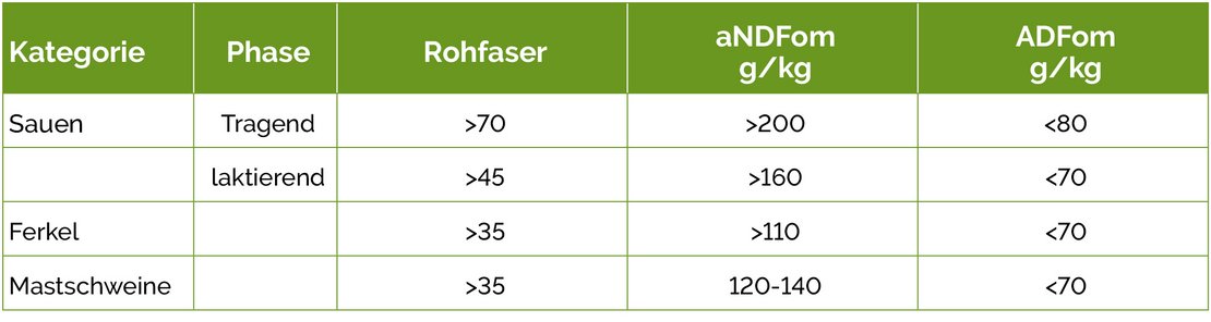 Die Diskussion über die Bewertung von Futtermitteln, die einen hohen Faseranteil haben, ist in vollem Gange. Bisher war es vor allem der Parameter Rohfaser, der die Bewertung in der Schweinefütterung dominierte. Mittlerweile wissen wir aber, dass gerade besser lösliche Faserstoffe eine wichtige Rolle im Bereich Fütterung und Darmgesundheit spielen und die werden mit der Rohfaser nicht erfasst. Der erste Schritt zu einer verbesserten Bewertung können wir leisten, wenn wir die schon in der Rinderfütterung gebräuchlichen Parameter ADFom (Säure-Detergenzien-Faser) und aNDFom (Neutral-Detergenzien-Faser) nutzen. Damit können zumindest die Hemicellulosen erfasst werden.