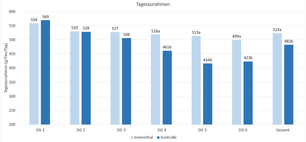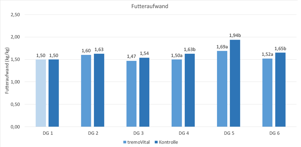 Betrachtet man die Leistungen in den einzelnen Durchgängen fällt auf, dass sich gerade in den Durchgängen, in denen insgesamt geringere Zunahmen in den Kontrollgruppen erreicht wurden (DG 4-6), der Zusatz von tremoVital signifikant verbesserte Zunahmen und Futteraufwände bewirkt. Das spricht dafür, dass die verbesserte Faserzufuhr für stabilere Verhältnisse im Darm sorgt und das Futter besser verdaut werden kann, auch wenn es möglicherweise einen höheren Druck von Keimen im Darm gibt, die der guten Verdauung entgegenwirken.