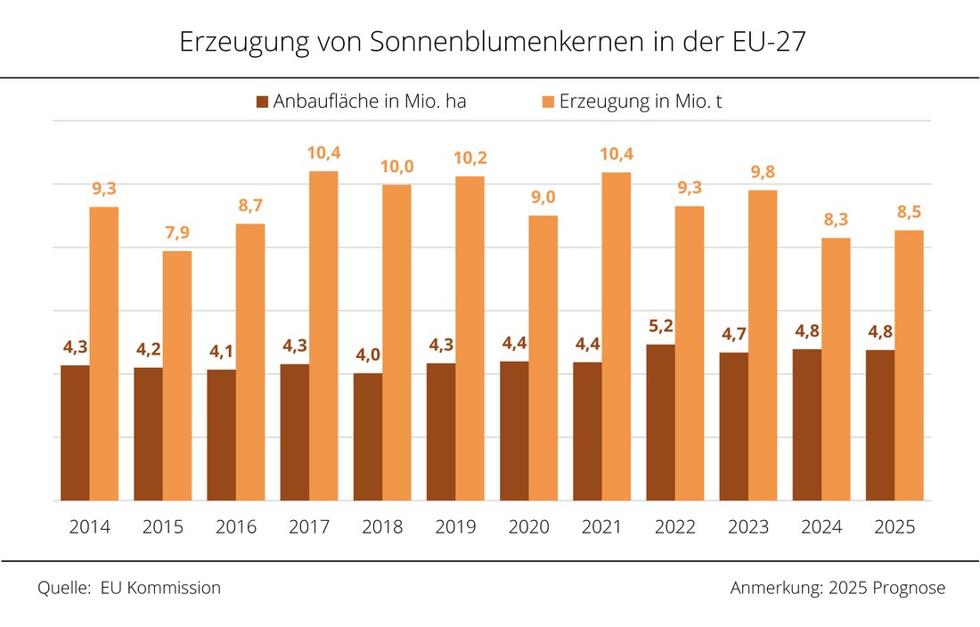 Im Jahr 2025 werden in der EU nach Schätzungen der EU-Kommission gut 8,5 Mio. t Sonnenblumenkerne erzeugt. Dies wäre ein Plus von knapp 3 % gegenüber dem enttäuschenden Jahr 2024. Dabei konnten die gestiegenen Erträge das etwas kleinere Areal in der EU teilweise kompensieren. Dennoch bleibt die drittkleinste Ernte der vergangenen 10 Jahre festzuhalten.