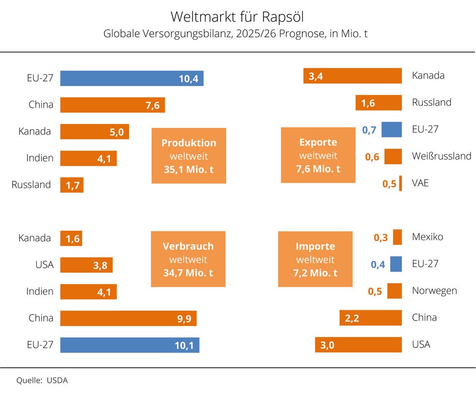 Das US-Landwirtschaftsministerium (USDA) schätzt die globale Rapsölproduktion im Wirtschaftsjahr 2025/26 auf etwa 35,1 Mio. t und damit um rund 1,4 Mio. t höher als in der vergangenen Saison. Größter Verbraucher ist die EU mit knapp 10,1 Mio. t, gefolgt von China mit 9,9 Mio. t und Indien mit 4,1 Mio.t. Größter Rapsölimporteur sind die USA mit 3,0 Mio. t., u. a zur Herstellung von Biokraftstoffen. Während sich die EU-Mitgliedstaaten praktisch selbst versorgen, muss China 2,2 Mio. t importieren.