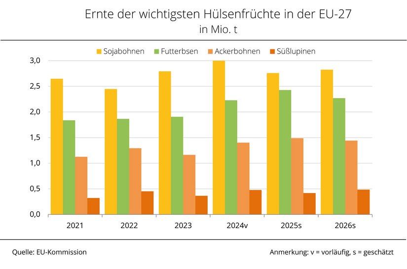 Die Europäische Kommission erwartet nach einer Schätzung von Ende März in der EU im Jahr 2026 eine Ernte von gut 7,0 Mio. t Hülsenfrüchte; dies wären 1 % weniger als im Vorjahr. Der Rückgang ist nach Einschätzung der Agrarmarkt Informations-Gesellschaft (mbH) vorrangig auf eine leichte Reduzierung der Anbaufläche zurückzuführen, denn die Erträge werden im Mittel bislang knapp über Vorjahresniveau taxiert.