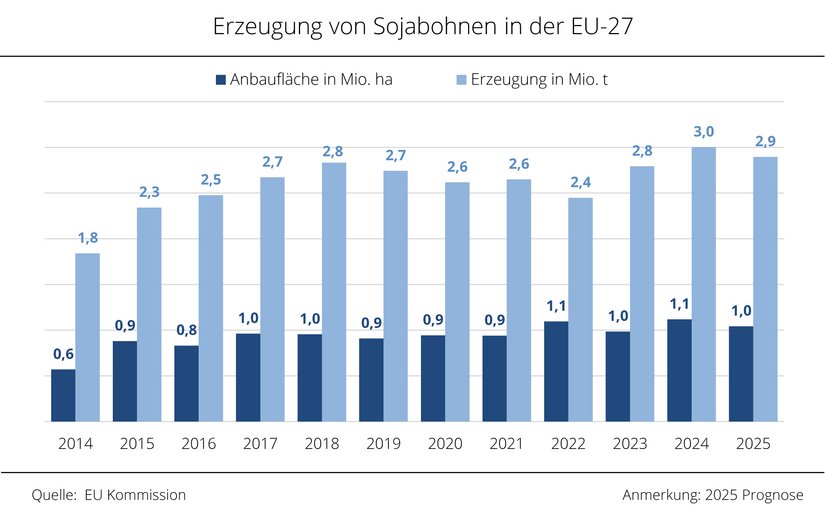 In ihrer aktuellen Schätzung korrigierte die EU-Kommission die Prognose für die Produktion von Sojabohnen in der EU marginal nach oben. Mit knapp 2,9 Mio. t sind demnach 2025 rund 18.000 t mehr geerntet worden als noch im Oktober erwartet. Auf Jahressicht entspricht das dennoch einem Minus von voraussichtlich 106.000 t. Verantwortlich dafür ist die rund 7 % kleinere Anbaufläche, denn die Erträge dürften mit durchschnittlichen 27,8 dt/ha das Vorjahresergebnis von 26,8 dt/ha ebenso übertreffen wie das langjährige Mittel.