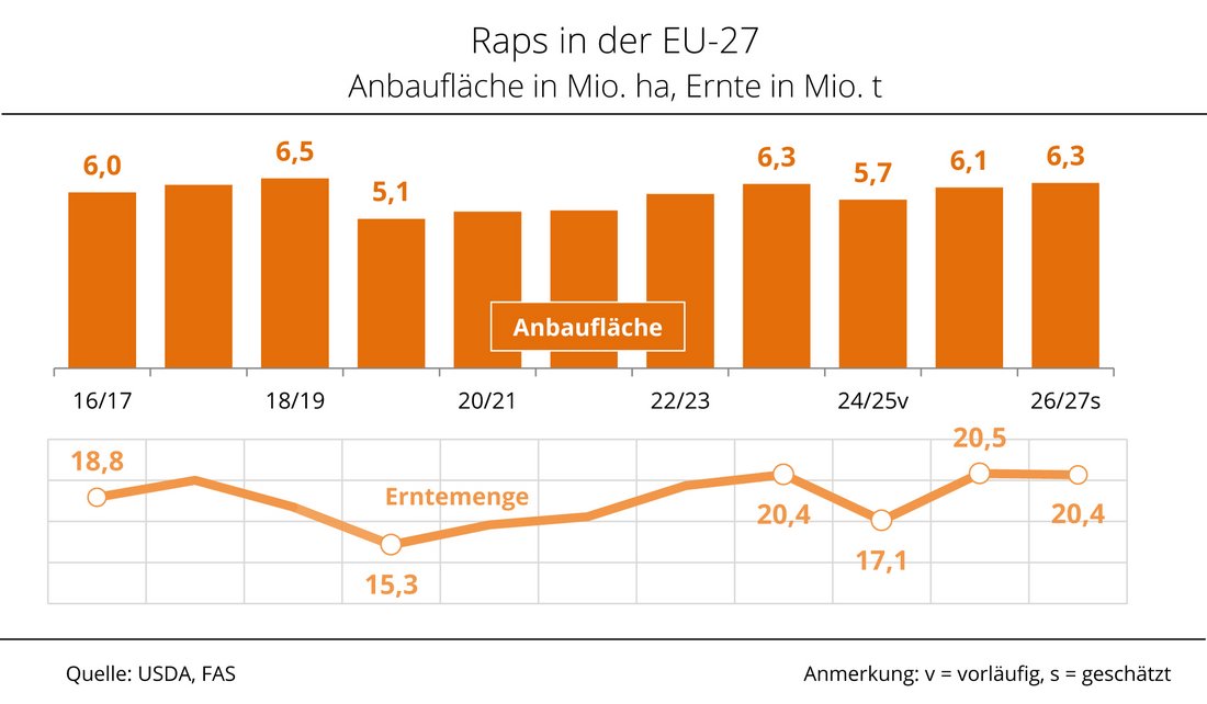 Zur Ernte 2026 erwarten Experten des US-Landwirtschaftsministeriums in der Europäischen Union ein Flächenplus für Raps. Die attraktiven Erzeugerpreise für Raps im Herbst 2025 boten einen Anreiz für eine Ausweitung der Anbaufläche.