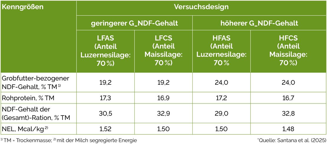 Die Fütterungsgruppen bestanden aus zwei unterschiedlichen G_NDF-Stufen [19 % G_NDF (= LF-Diät) oder 24 % G_NDF (= HF-Diät), Angaben beziehen sich auf die TM]. Zusätzlich wurden das Verhältnis von Mais (CS)- und Luzernesilage (AS) in der TMR variiert (Verhältnis von AS:CS: 70:30 oder aber 30:70). Alle Rationen wurden als TMR verabreicht.