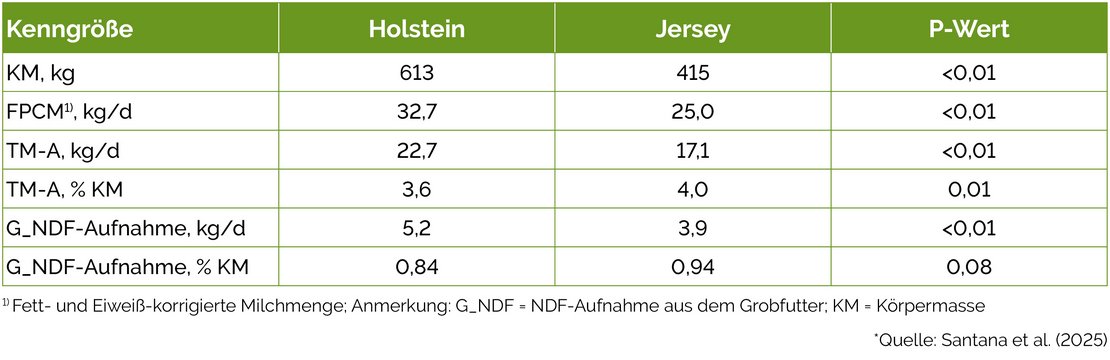 Auch die tägliche G_NDF-Aufnahme war bei Holstein-Kühen – wiederum ausgedrückt als Prozentsatz des Körpergewichts – niedriger als bei Jerseykühen (Tab. 2).