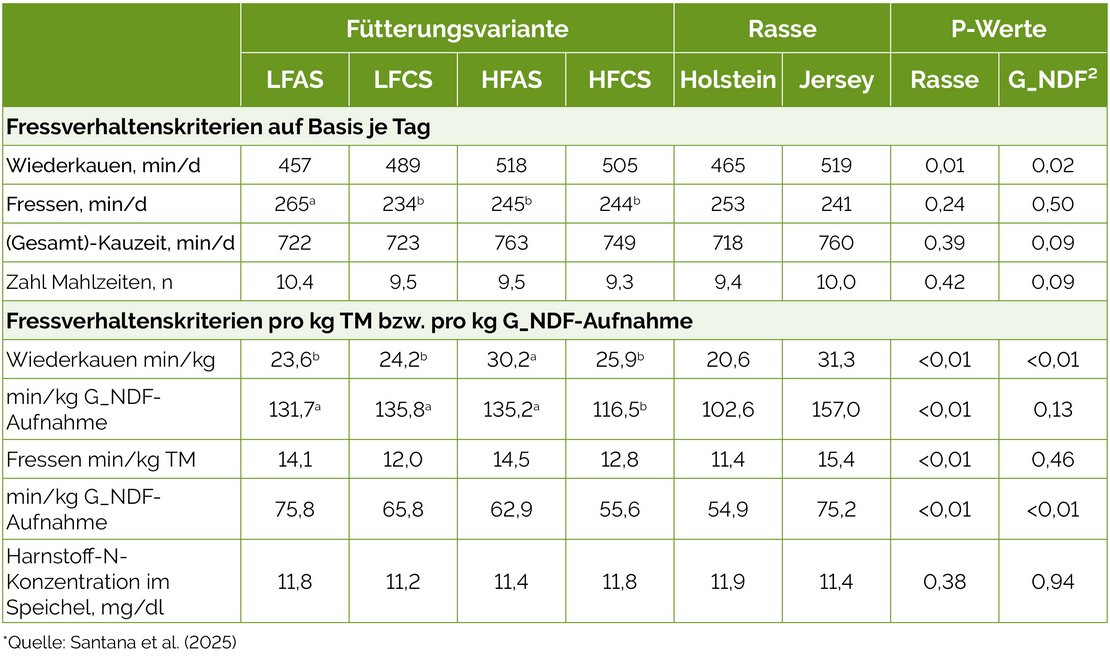 Die (Gesamt-)Kauzeit unterschied sich nicht signifikant zwischen den Rassen, aber Jersey-Kühe hatten eine höhere Wiederkauzeit als Holstein-Kühe (519 ± 99 vs. 465 ± 113 min/d) sowie eine höhere Fress- und Wiederkauzeit pro kg Trockenmasse bzw. pro kg G_NDF.