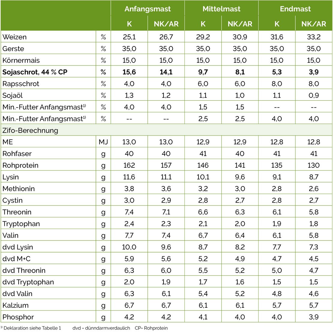 Die Anfangs- und Endmastmineralfutter aller Versuchsgruppen unterschieden sich weder bei den ernährungsphysiologischen noch bei den technologischen und zootechnischen Zusatzstoffen. Lediglich beim Vitamin D3 waren in den Mineralfuttermitteln für die Anfangsmast geringe Unterschiede zu erkennen.