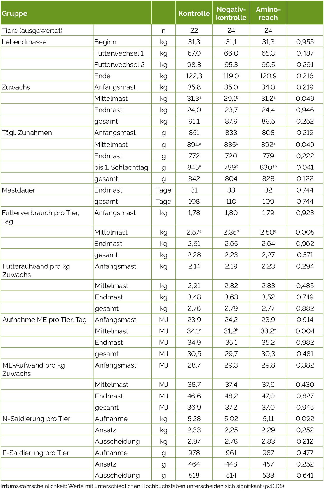 In der Anfangs- und Endmast zeigte sich kein signifikanter Effekt auf die täglichen Zunahmen. Diese lagen in der Anfangsmast zwischen 808 Gramm (Aminoreach) und 851 Gramm (Kontrolle) sowie in der Endmast zwischen 720 Gramm (Negativkontrolle) und 779 Gramm (Aminoreach). Demgegenüber waren in der Mittelmast die täglichen Zunahmen in der Kontrollgruppe mit 894 Gramm und der Aminoreachgruppe mit 892 Gramm signifikant höher als in der Negativkontrolle mit 835 Gramm. Im Mittel des Versuchs lagen die täglichen Zunahmen zwischen 804 Gramm in der Negativkontroll- und 842 Gramm in der Kontrollgruppe. Der Lebendmassezuwachs über die gesamte Mast hinweg betrug zwischen 88 und 91 Kilogramm. Signifikante Unterschiede wurden weder bei den täglichen Zunahmen noch beim Lebendmassezuwachs festgestellt.