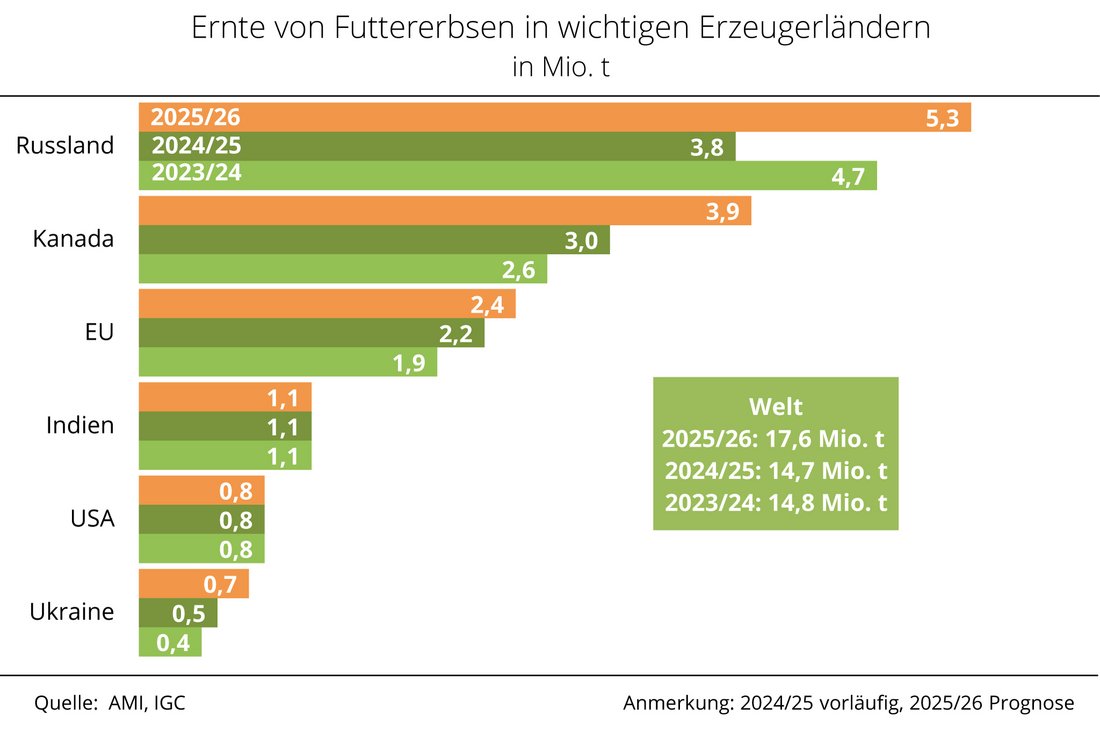 Trotz einer kleineren Anbaufläche ist die Erzeugung 2025 in Russland, dem weltweit größten Erzeuger von Futtererbsen, nach Einschätzung des Internationalen Getreiderates (IGC) um fast 40 % auf den Spitzenwert von 5,3 Mio. t gestiegen. Ausschlaggebend sind nach Recherche der Agrarmarkt Informations-Gesellschaft (mbH) vorrangig die sehr guten Erträge. Für Kanada taxiert der IGC die zur Vermarktung verfügbare Ernte im Vergleich zu 2024/25 auf 3,9 Mio. t und damit um ein Drittel höher. Ursache ist hier die um 8 % ausgedehnte Anbaufläche, Insbesondere in der Provinz Alberta. Eine günstige Witterung in Saskatchewan und Alberta führte zudem zu höheren Erträgen.