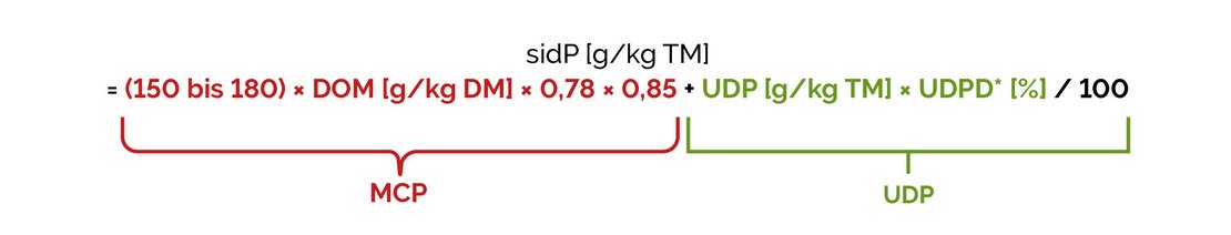 Im neuen Proteinbewertungssystem wird nun richtigerweise berücksichtigt, dass die Aminosäurengehalte im Mikrobenprotein und im UDP und auch die Dünndarmverdaulichkeit des Proteins variabel sind. Damit einhergehend wird die Proteinbewertung zukünftig auf dem dünndarmverdaulichen Protein (sidP: small intestinal digestible Protein) basieren und nicht mehr auf dem nXP. Das sidP ist die Summe des im Dünndarm verdaulichen Aminosäuren-Stickstoffs x 6,25.