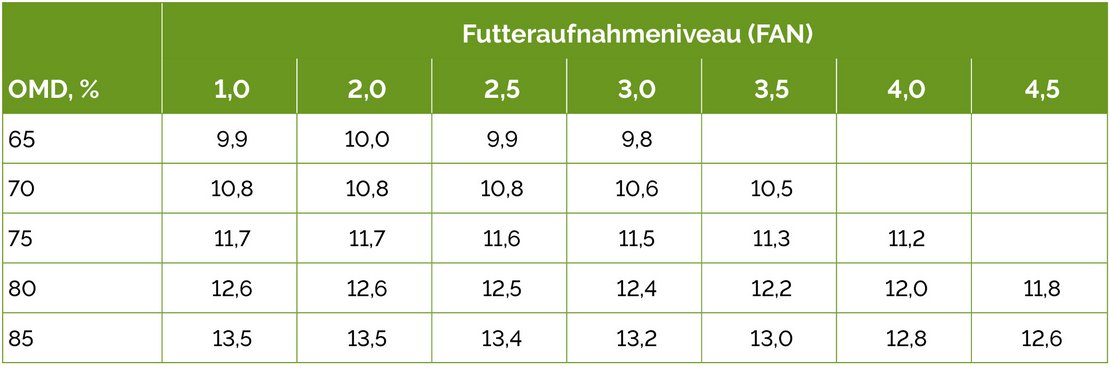 Übersicht 2: Orientierungswerte für den ME-Gehalt (MJ/kg organischer Masse) in Abhängigkeit von der Verdaulichkeit der organischen Masse (OMD) und dem Futteraufnahmeniveau (FAN)