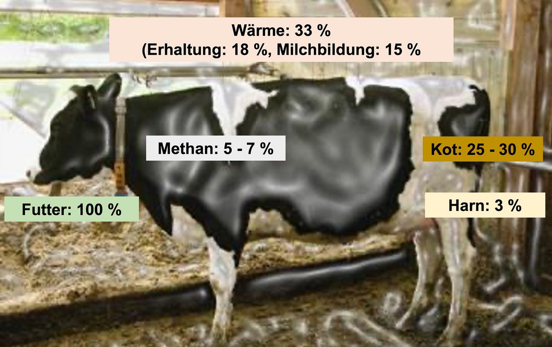 Diese in den Nährstoffen gespeicherte Energie kann das Tier jedoch nicht zu 100 % verdauen. Bei Kühen wird i.d.R. mit 25 bis 30 % Energieverlusten über den Kot gerechnet. Weitere Energieverluste entstehen durch den Harn (ca. 3 %) und die v.a. bei der Pansenfermentation entstehenden Gärgase (Methan: 5 - 7 %). Werden diese 3 Verlustquellen – Kot-, Harn-, Methan-Energie – von der Bruttoenergie abgezogen, bleibt dem Tier die umsetzbare Energie (ME). Darüber hinaus entstehen Wärmeverluste bei der Energieverwertung in Größenordnung von 33 % (Übersicht 1).