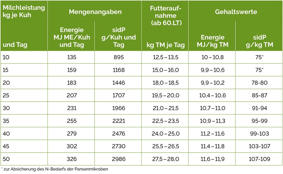 An dieser Stelle soll nochmals erwähnt werden, dass Tiere grundsätzlich keinen Bedarf an bestimmten Inhaltsstoffkonzentrationen in den Rationen haben, sondern immer einen entsprechenden Mengenbedarf. Die dann mit den Rationen ausgewiesenen Gehaltswerte ergeben sich stets aufgrund der dabei unterstellten Futteraufnahme. Hierfür und für eine hohe Futter- und Nährstoff-Effizienz ist also die Kenntnis der tatsächlichen Futteraufnahme der Herde bzw. der Tiergruppen zwingend notwendig.