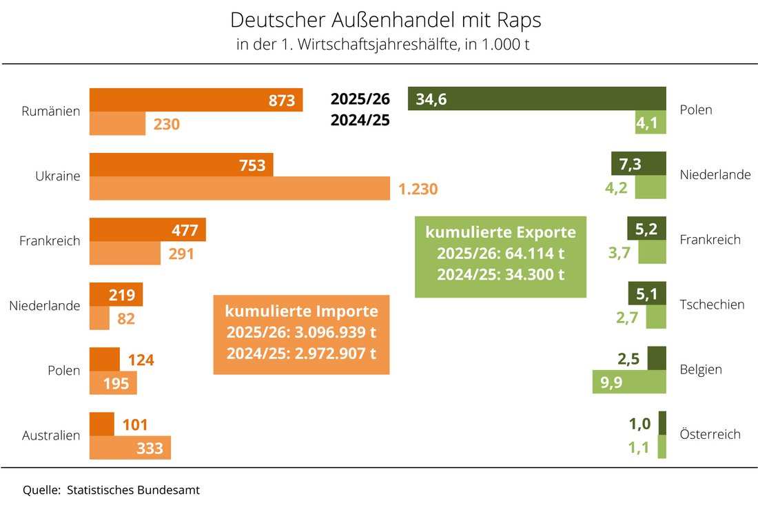 Deutschland ist der größte Nettoimporteur in der EU, dementsprechend fallen die Ausfuhren relativ gering aus, trotz der größeren Ernte. In den ersten sechs Monaten der laufenden Saison exportierte die Bundesrepublik nur rund 64.100 t Raps, das sind rund 87 % mehr als im Vorjahreszeitraum. Deutscher Raps geht vor allem in andere EU-Mitgliedsstaaten, zum Beispiel nach Polen (34.600 t), in die Niederlande (7.300 t) und nach Frankreich (5.200 t).
