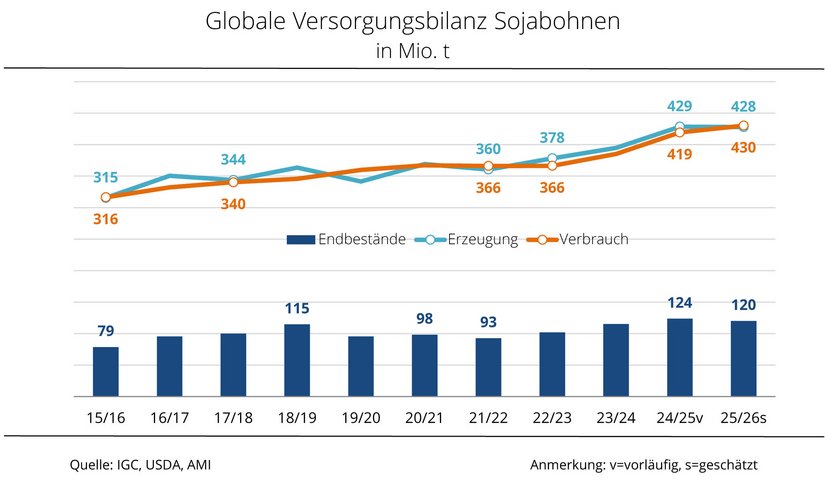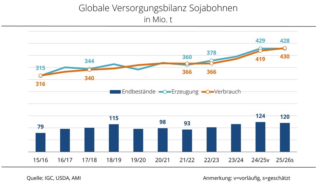 Der Internationale Getreiderat (IGC) schätzt die weltweite Sojaproduktion 2025/26 auf 428 Mio. t. Die USA dürften infolge ungünstiger Witterung und verzögerter Erntearbeiten mit 116 Mio. t rund 3 % weniger ernten als in der vergangenen Saison. Brasilien steuert dagegen auf ein Rekordniveau zu und festigt seine Rolle als wichtigster Anbieter am Weltmarkt. Erwartet wird eine Erzeugung von 177 Mio. t, das entspricht einer Anbaufläche von ca. 47 Mio. ha oder dem Vierfachen der Ackerfläche Deutschlands. In Argentinien wird die Sojaproduktion mit 48,5 Mio. t etwas schwächer eingeschätzt, da viele Betriebe auf Mais und Sonnenblumen umgestellt haben. Der globale Verbrauch erreicht nach IGC-Berechnungen rund 430 Mio. t und damit ein neues Allzeithoch. Wachstumstreiber sind die weiter steigende Nachfrage nach Fleisch und damit nach Proteinfuttermittel, u.a. für die stark wachsende Lebensmittelproduktion in Asien
