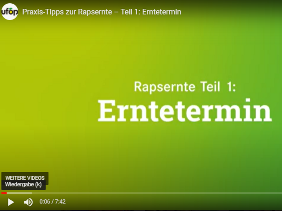 Mit dem Thema Rapsernte startet die UFOP ein Angebot, das in der Folge zu einer ganzen Serie weiterer Öl- und Eiweißpflanzen ausgebaut wird. Die ersten vier Videos zum Raps befassen sich mit der Frage nach dem optimalen Erntetermin sowie der richtigen Einstellung von Schneidwerk, Dreschwerk und Reinigung. Damit will der Verband einen Beitrag leisten, um den gewachsenen Rapsertrag möglichst verlustfrei einbringen zu können sowie die optimale Leistung des Mähdreschers im Bestand zu erschließen.