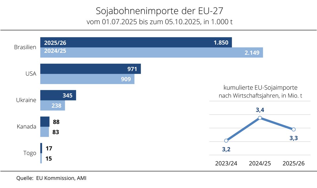 Nach Angaben der EU-Kommission bezog die Europäische Union von Juli bis Anfang Oktober 2025 knapp 3,3 Mio. t Sojabohnen, rund 129.000 t weniger als im gleichen Zeitraum der Saison 2024/25. Hauptlieferanten bleiben Brasilien und die USA, wobei ersteres nach Recherche der Agrarmarkt Informations-Gesellschaft (mbH) seine Liefermenge deutlich reduzierte. So erhielt die Union aus Brasilien in den ersten drei Monaten mit rund 1,8 Mio. t Soja rund 14 % weniger als im Vergleichszeitraum 2024/25. Damit sinkt der Importanteil auf 56,3 %. Brasilien bleibt dennoch das mit Abstand wichtigste Herkunftsland für die Union.
