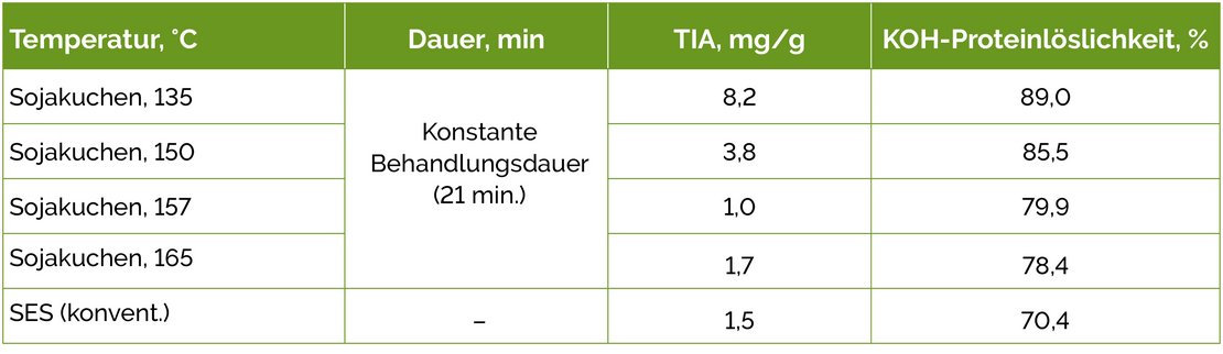 Die NIRS-analytisch ermittelten TIA und KOH-Proteinlöslichkeit der jeweiligen Behandlung der Sojabohnen sind in Tabelle 1 ausgewiesen. Mit zunehmendem Eintrag an Temperatur unter konstanter Behandlungsdauer konnte der Gehalt an TIA reduziert werden. Mit steigendem Grad an Denaturierung konnte eine reduzierte Löslichkeit des Proteins in KOH nachgewiesen werden.