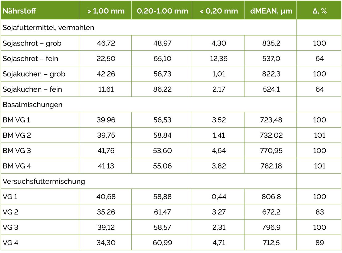 Die Vermahlung des Sojafuttermittels mit einem 2,5 mm Sieb führt gegenüber einem 6,5 mm Sieb zu einem rund 35% kleineren Durchschnittspartikel (dMEAN: Durchschnittspartikel; rd. 300 µm; ∆ %). Dieser Unterschied ist folglich ebenfalls in den Versuchsfuttermischungen ersichtlich, wobei die zu Grunde liegende Basalmischungen (BM, vor der Integration der Sojafuttermittel) der jeweiligen Vergleichsgruppen VG 1 und VG 2 sowie VG 3 und VG 4 ident war und somit keinen Einfluss übt.