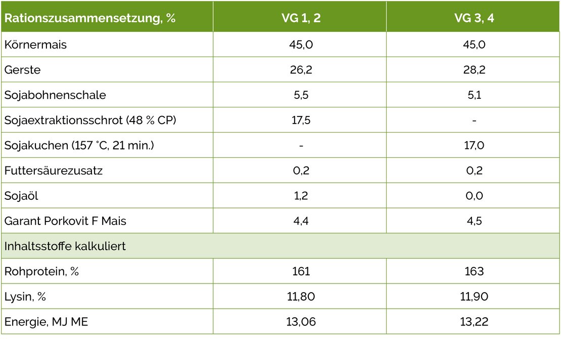 Die Versuchsfuttermischungen (Tabelle 5) wiesen unvermahlenen (VG 1) sowie fein vermahlenem Sojaextraktionsschrot (48 % Rohprotein; VG 2) im Austausch gegen grob (VG 3) bzw. fein vermahlenem (VG 4) optimiert prozessierten Sojakuchen auf (siehe oben, TIA, 1,0 mg/g; KOH-Proteinlöslichkeit 79,9%). Die grobe Vermahlung des jeweiligen Sojafuttermittels erfolgte unter Nutzung einer Sieblochgröße von 6,5 mm und wurde einer feinen Vermahlung von 2,5 mm gegenübergestellt. Die weiteren Komponenten der Basalmischung (BM; Mais, Gerste, etc.) wurden mittels 3,5 mm Sieblochgröße vermahlen. Bei diesem Fütterungsversuch erfolgte kein Einsatz von Kartoffeleiweiß und der Gehalt an Rohprotein bzw. der Aminosäuren wurde reduziert, um die nährstoffliche Stärke des Sojakuchens hervorzuheben.