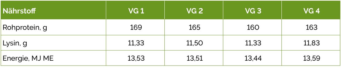 Auch in diesem Versuch stimmen die analysierten Energie- und Nährstoffgehalte auf Basis der NIRS-Abschätzung mit den kalkulierten Werten gut überein (Tabelle 7).