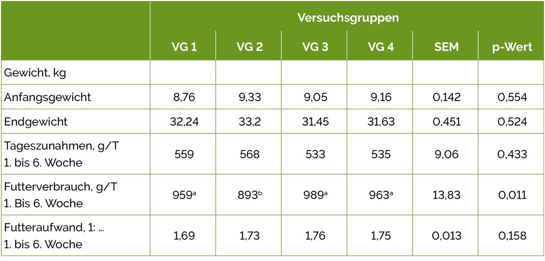 In Tabelle 5 sind die Leistungsdaten der Ferkel veranschaulicht. Der Einsatz von grob bzw. fein vermahlenem Sojakuchen im Austausch gegen Sojaschrot beeinflusste die tägliche Zunahme (Tgz) sowie den Futteraufwand (FV) nicht. Hinsichtlich des Futterverbrauchs wiesen jene Ferkel der VG 2, die fein vermahlenem Sojaschrot aufnahmen, über den gesamten Versuchszeitraum den geringsten Futterverbrauch aus.