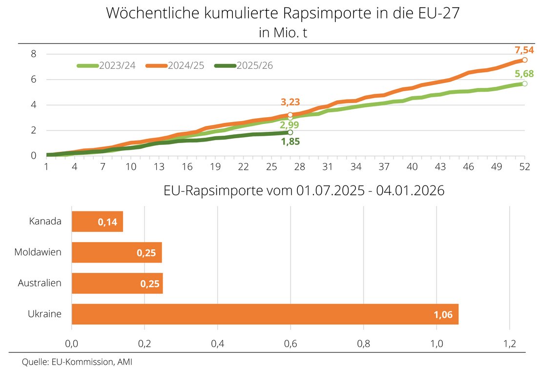 Insgesamt importierte die EU-27 in der ersten Hälfte des Wirtschaftsjahres 2025/26 kumuliert rund 1,85 Mio. t Raps. Damit lagen die Einfuhren um knapp 43 % unter dem Vorjahresniveau von 3,23 Mio. t. Mit bislang 1,06 Mio. t und einem Importanteil von gut 57 % bleibt die Ukraine das dominierende Lieferland. Das Vorjahresvolumen von 2,02 Mio. t wird jedoch deutlich verfehlt.