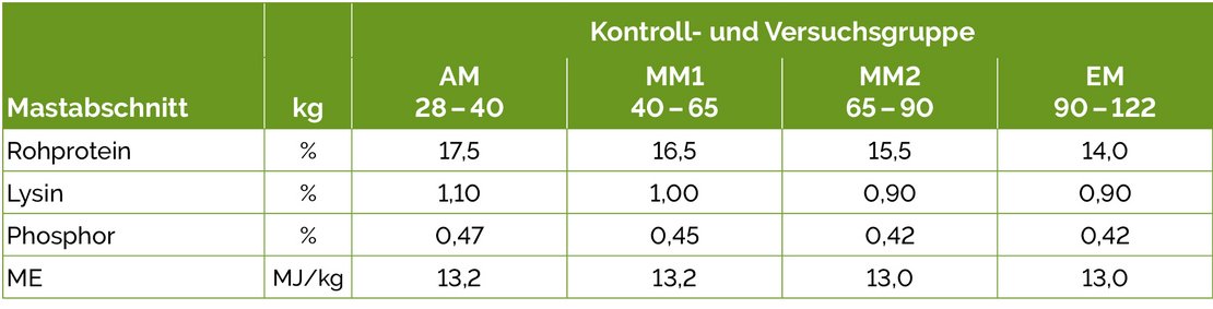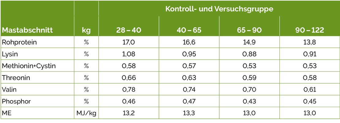 Pro Abteil wurden in vier Buchten je zehn Tiere gehalten. In jeder Bucht ist eine Futterstation mit Einzeltiererkennung über Transponder-Ohrmarken installiert. Neben dem Gülleanfall wurden auch die Tränk- und Prozesswassermengen mittels Ringkolbenzähler erfasst. Die vierphasige Trockenfütterung mit pelletiertem Fertigfutter erfolgte ad libitum. Die Tiere wurden bei jedem Futterwechsel gewogen.