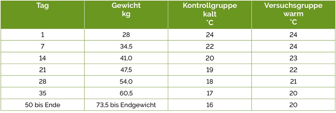 In der Leistungsprüfungsanstalt Quakenbrück wurden 200 kupierte Ferkel (Topigs Norsvin, Pietrain Select x Topigs TN 70) nach Gewicht und Geschlecht auf zwei Gruppen in fünf baugleichen Abteilen verteilt und bei unterschiedlicher Stalltemperatur gehalten. In der Kontrollgruppe (kalt) mit 120 Tieren erfolgte die Temperaturführung nach der Stalltemperaturkurve der LWK Niedersachsen. Die beiden Abteile der Versuchsgruppe (warm) mit 80 Tieren wurden ca. 3 °C wärmer gefahren.