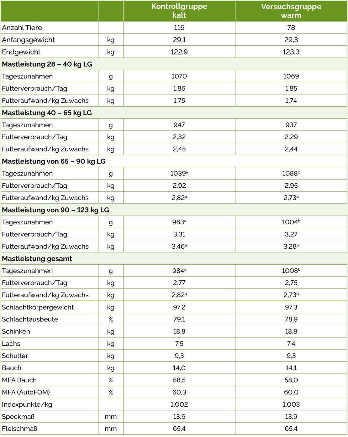 Im Mittel lagen die Tageszunahmen bei 994 g und der Futteraufwand bei 2,78 kg je kg Zuwachs. In der Kontrollgruppe (niedrigere Stalltemperatur) wurden 984 g und in der Versuchsgruppe (Kontrolle +3°C) 1008 g Tageszunahmen erreicht. Der Futteraufwand je kg Zuwachs lag bei 2,82 (Kontrolle) bzw. 2,73 kg (Versuch). Die Unterschiede in diesen beiden Merkmalen ließen sich absichern, wohingegen der tägliche Futterverbrauch gleich war (2,77 vs. 2,75 kg). Bereits in der Phase ab 65 kg waren die Differenzen signifikant.