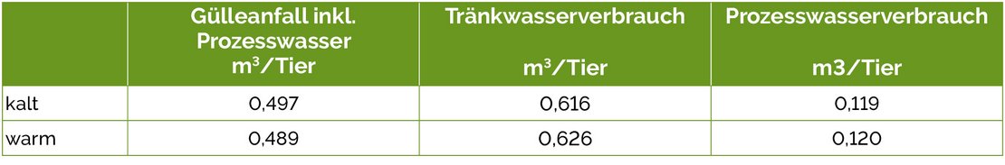Der Verbrauch an Tränk- und Prozesswasser wurde mittels Ringkolbenzähler erfasst. Für die Stallreinigung stand keine Einweichanlage zur Verfügung. Die Kontrollgruppe (kalt) verbrauchte 0,616 m3 Tränkwasser und produzierte 0,497 m3 Gülle je Tier, die Versuchsgruppe (warm) 0,626 m3 bzw. 0,489 m3.